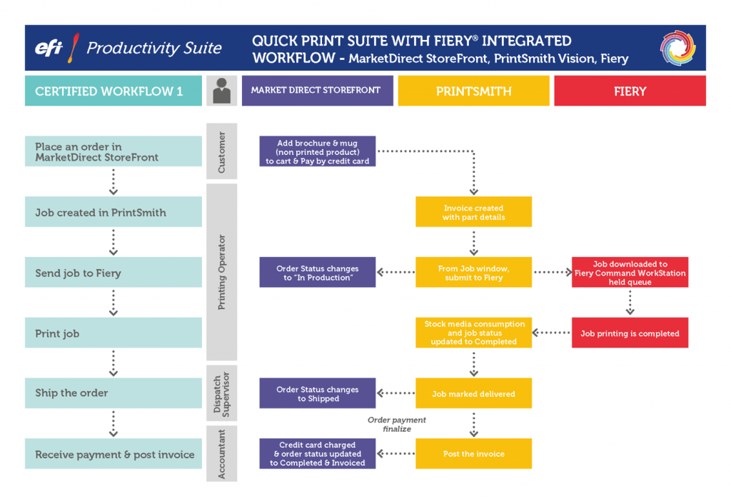 The Quick Print Suite is built around the flexible and powerful PrintSmith Vision MIS system and offers scalable industry-focused solutions for eCommerce, information management and print management. This includes the flexibility of PrintSmith Vision, the eCommerce power of MarketDirect StoreFront and the front-end power of Fiery to provide a complete solution for smaller print businesses. And it is IT and infrastructure worry free as a 100% hosted suite.